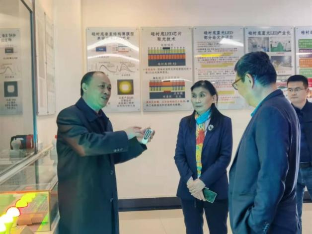 燕金元董事长一行在南昌大学高端医疗器械装备创新研究院院长黄菊花,中国科学院院士、南昌大学副校长、国家硅基LED工程技术研究中心主任江风益院士的陪同下,参观了创新研究院及硅基LED工程技术研究中心。江院士结合硅基产业化基地现场实况,详细介绍了硅基LED的技术发展历程及产业化应用现状,其团队创造直接经济效益已超30亿元,间接经济效益更达120亿元以上,产业化前景广阔。