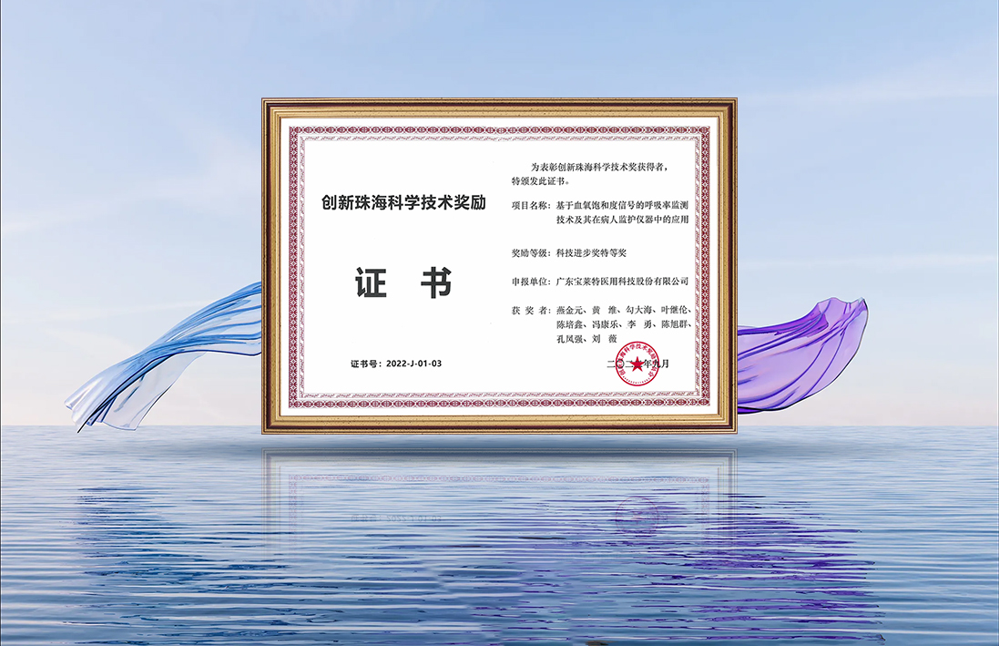 广东宝莱特医用科技股份有限公司董事长燕金元牵头完成的“基于血氧饱和度信号的呼吸率监测技术及其在病人监护仪器中的应用”项目,获得2022年度“创新珠海”科学技术特等奖。燕金元荣获“2022年度珠海市科技创新领军人物”称号。