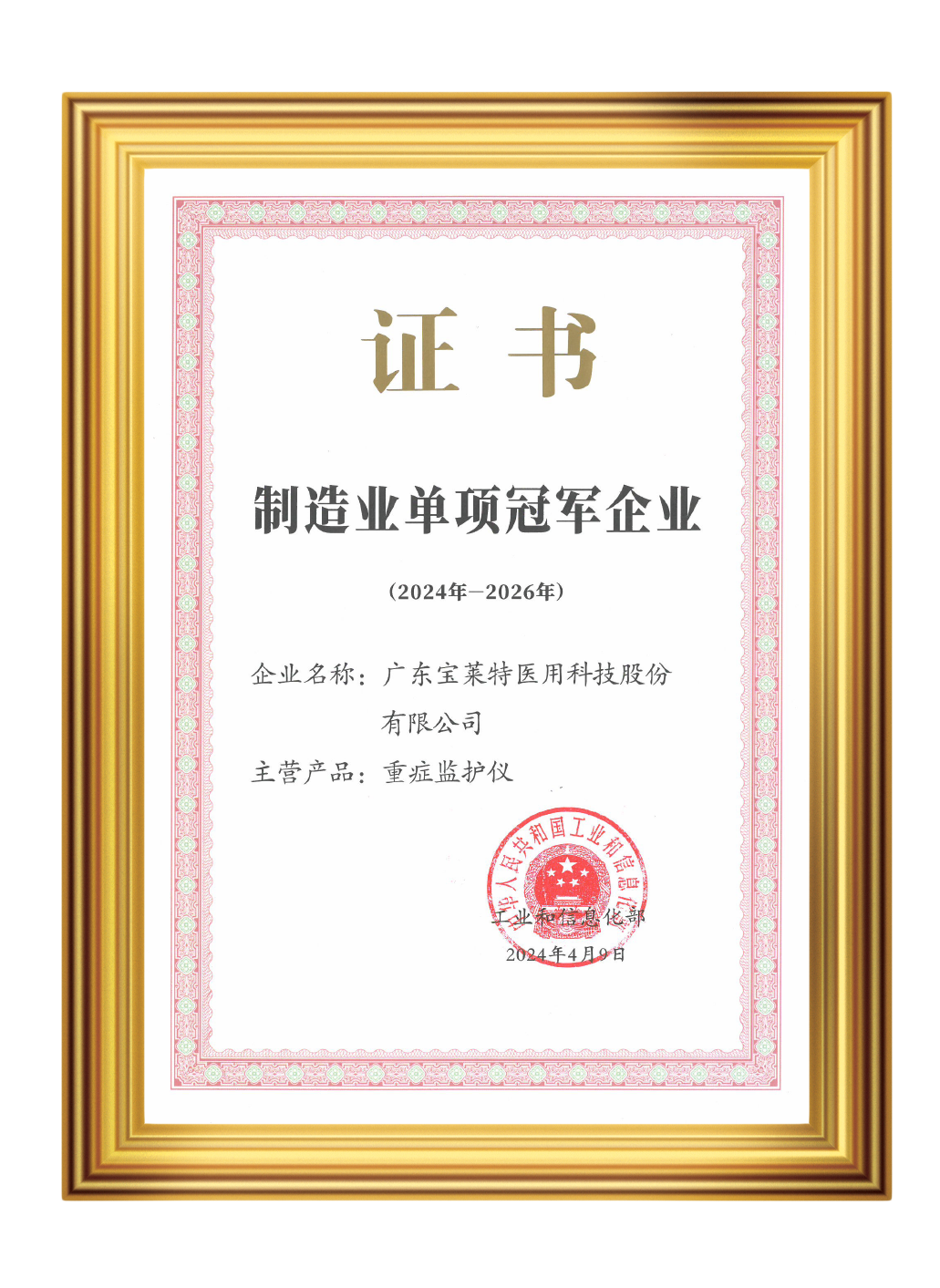 作为国内医疗器械老牌企业,多年来,宝莱特用长期主义给出了新质生产力的“宝莱特答案”。今年4月,广东省工业和信息化厅公示了第八批国家级制造业单项冠军企业名单,宝莱特荣获国家级制造业单项冠军企业奖项。