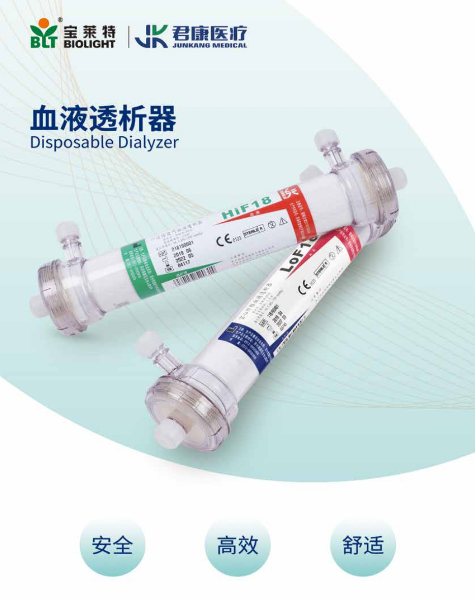 透析器是终末期肾病患者进行血液透析必用的耗材之一,但因生产透析器使用的中空纤维膜比头发丝还要细,对设备和工艺的要求极高。在国内,苏州君康就是中空纤维膜的头部生产商,其主营产品为血液透析膜和血液透析器,多年来苏州君康生产的中空纤维膜在海外得到极好的口碑。现在,宝莱特高瞻远谋控股君康,从血液透析机到中空纤维透析器, 宝莱特已经完全具备掌握核心技术的实力,将成为国内血液净化领域的核心力量。