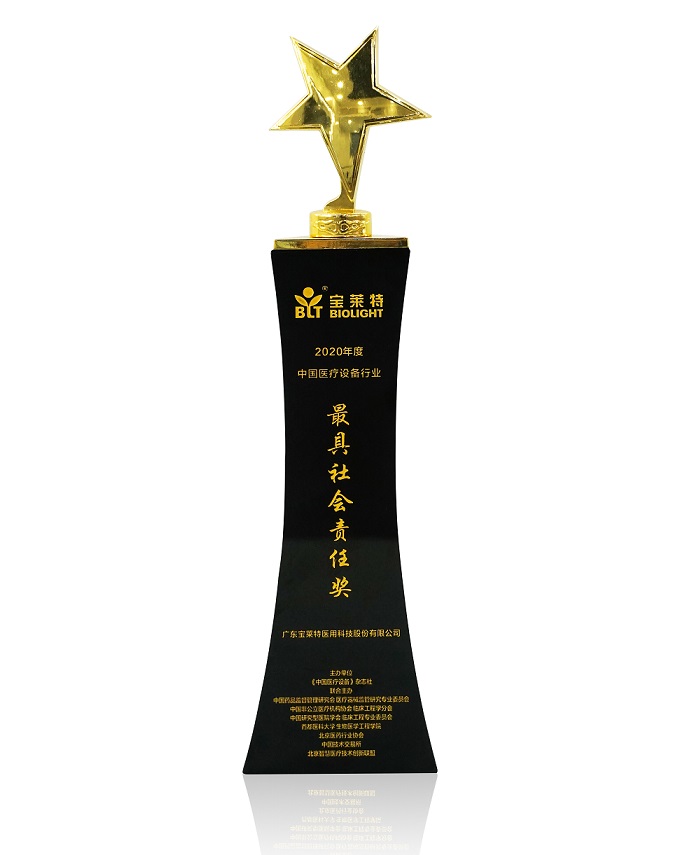宝莱特品牌建立的初心在于“贡献”,董事长燕金元先生说过:“把宝莱特做强做大,第一要素是要有创造社会价值的信念!”在2020年全球抗疫中,宝莱特集团提前复工复产,及时为前线输送监护仪和血液透析设备,并荣获中央赴湖北等疫情严重地区指导组、国家卫生健康委员会、国务院等多封感谢信。因此,《中国医疗设备》杂志社在此次大会上对宝莱特集团颁发了“2020年度中国医疗设备最具社会责任奖”,这份殊荣,彰显了宝莱特在特殊时期勇于担当的企业精神。